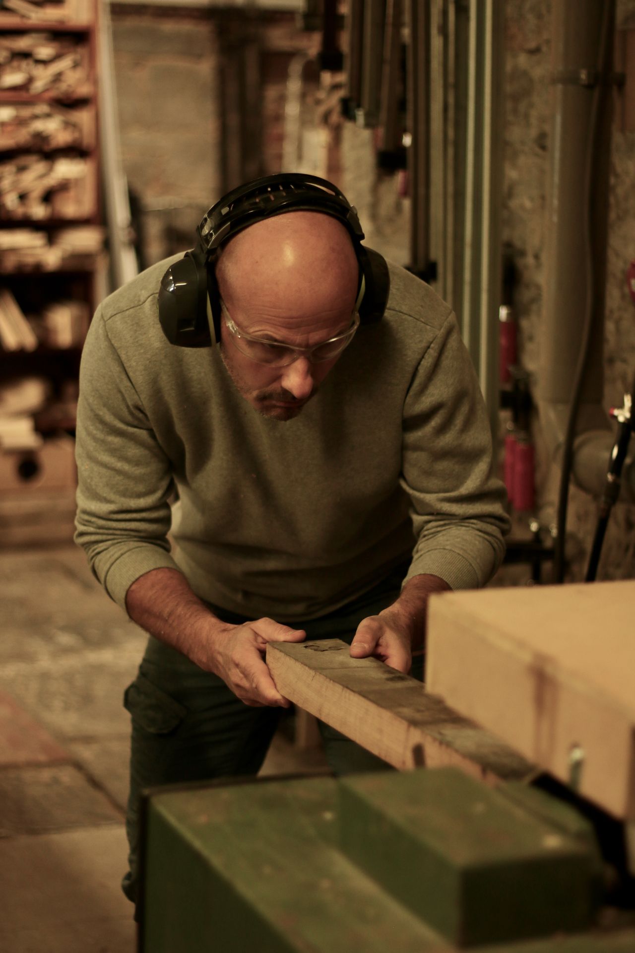 Dans l'atelier, beaucoup de bois massif local, notamment du chêne et du hêtre.